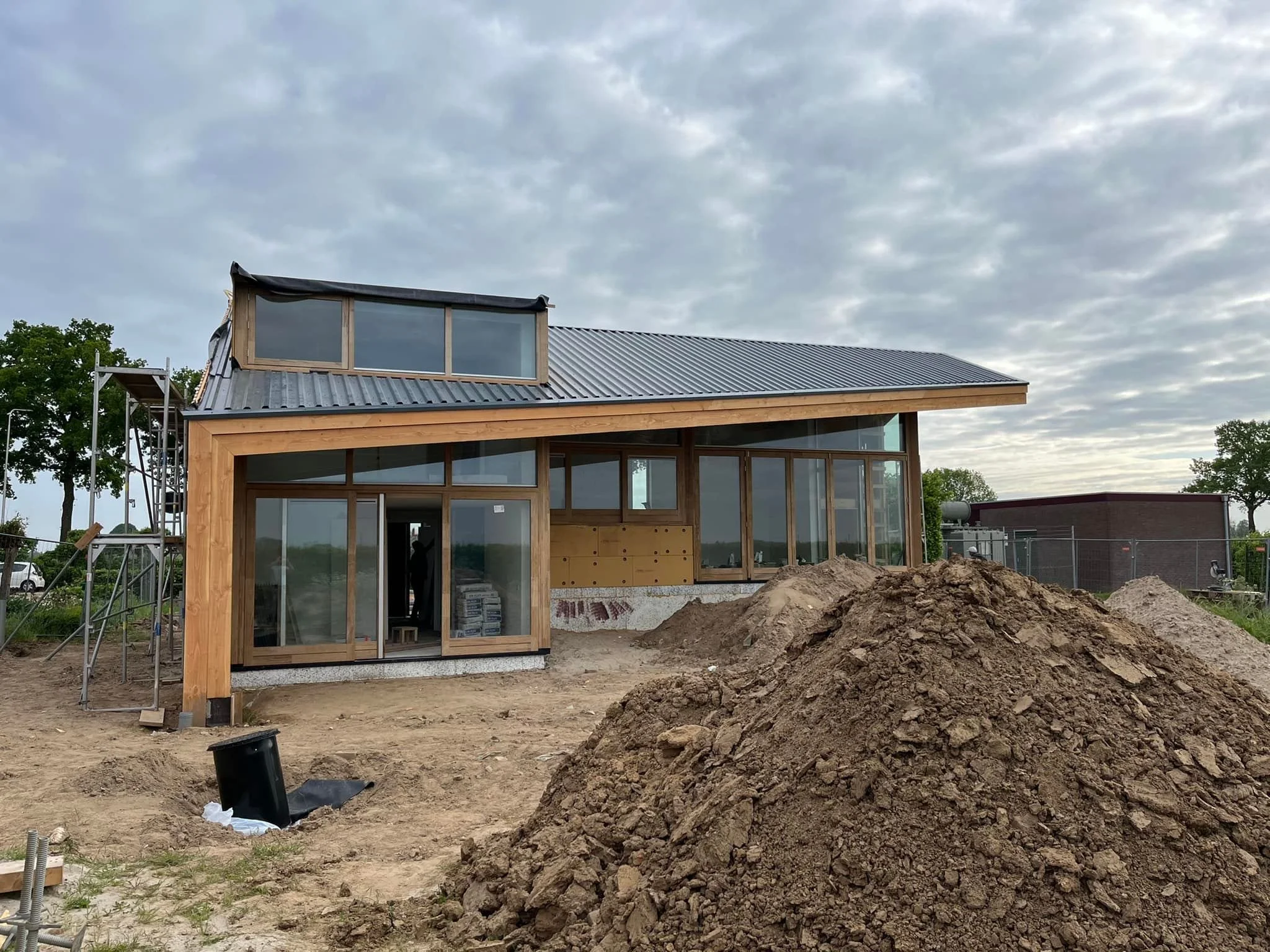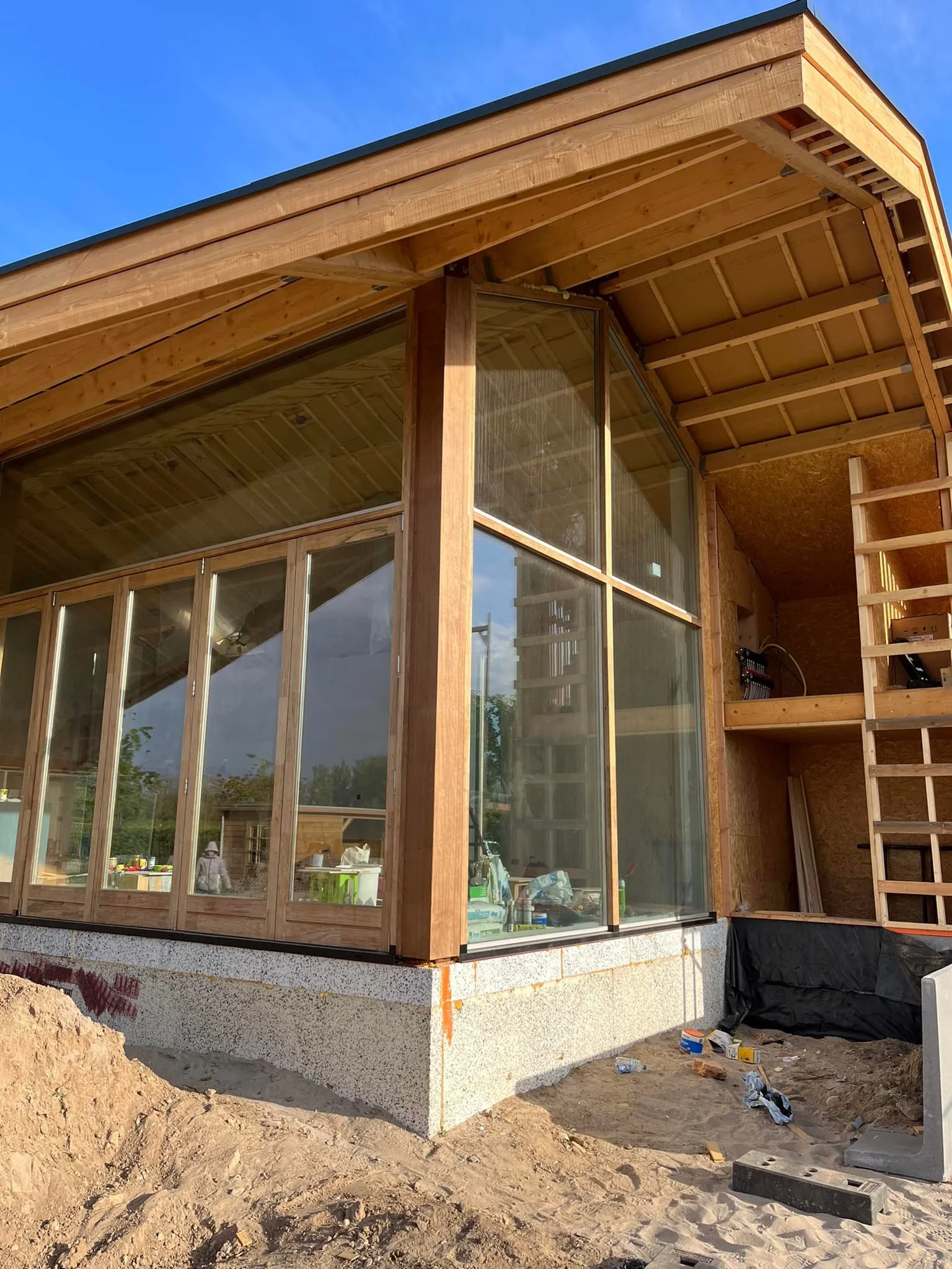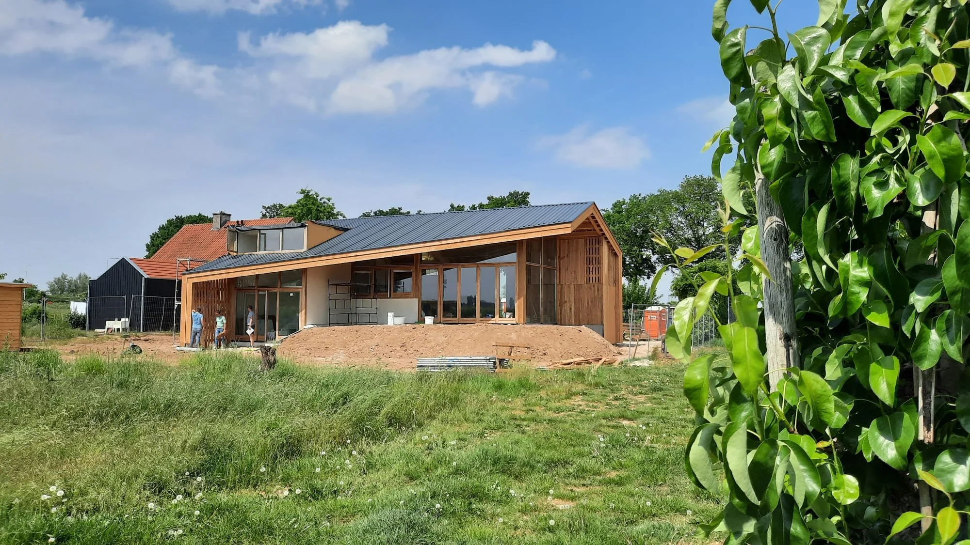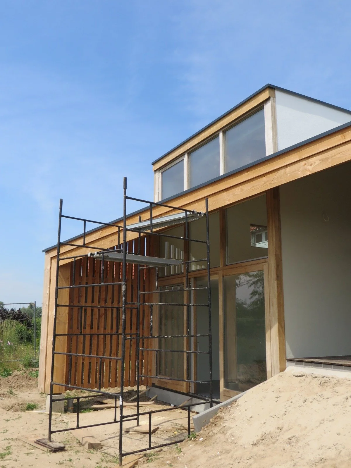 Na het schetsontwerp heb ik het project op me genomen om uit te tekenen, bouwaanvraag stukken te verzorgen en met de aannemer details uit te werken. En nu is het zover en wordt de woning gebouwd. Met bouwvergaderingen in het zonnetje op de plek waar de veranda gaat komen.
