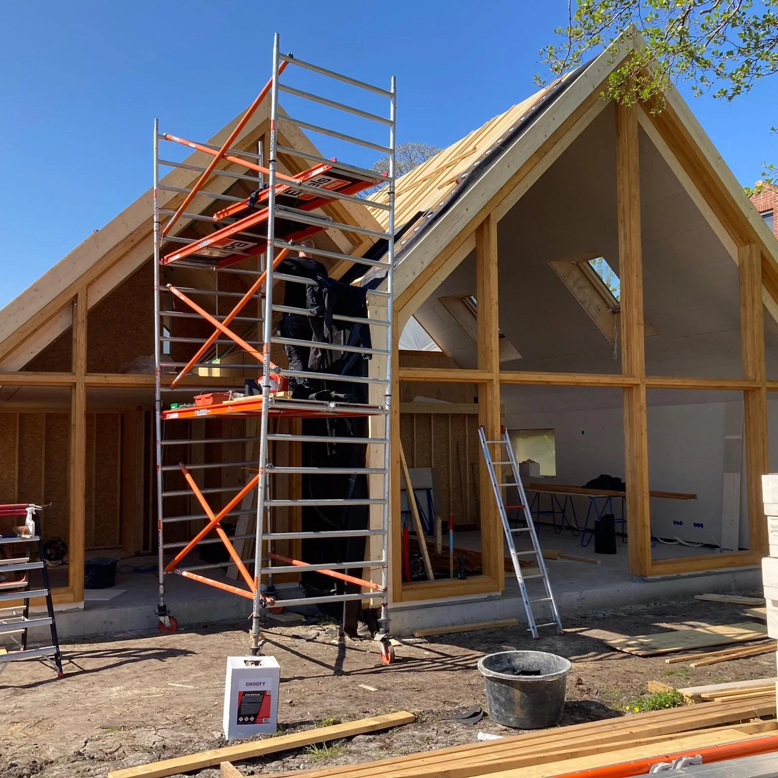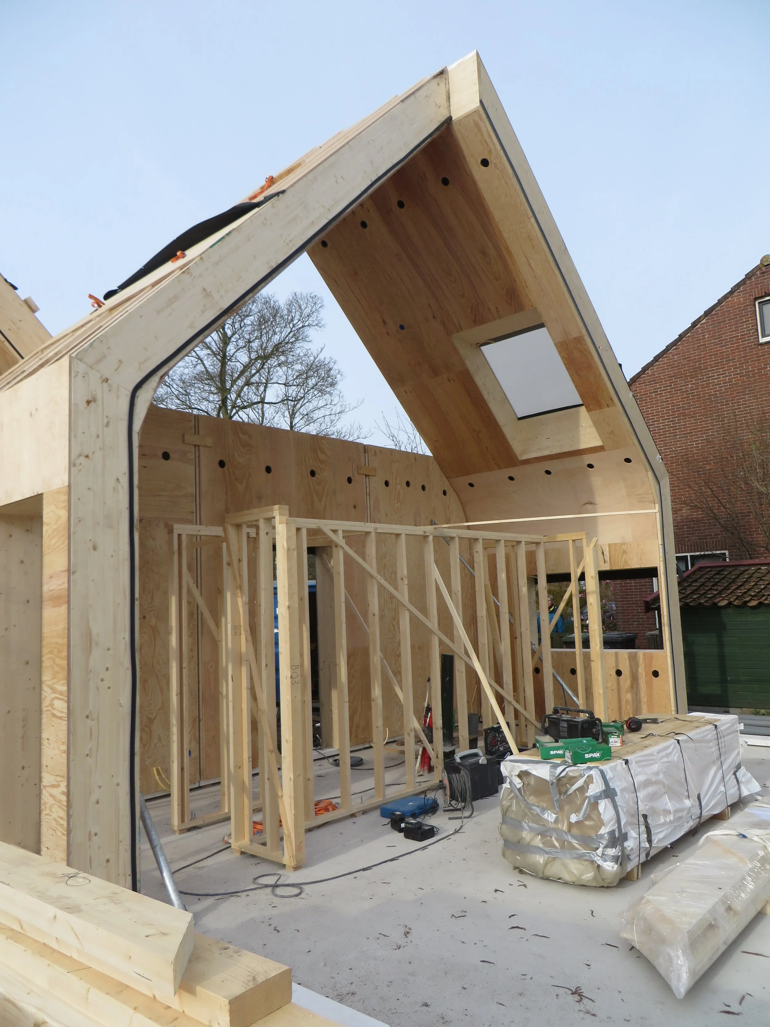 Vaak krijg ik de vraag wat een ‘Indigo woning’ betekent. De woning in Warder laat dit bij uitstek zien: in de hoek ter hoogte van de goot zit een speciale constructieve verbinding . Dit zie je in de vorm van de ronding aan de binnenzijde. Hierdoor hoeft er geen verdiepingsvloer of dwarsbalk te worden geplaatst om de (spat-)krachten van het schuine dak op te vangen. Daniel Venneman van Woonpioniers heeft dit principe ontwikkelend samen met de constructeur en Woodteq houtconstructies bv. Dit constructieve principe geeft aan de ontwerper, aan mij dus, enorm veel ruimte om een vrije indeling te maken, volledig afgestemd op de wensen van de opdrachtgever. Erg leuk om wederom zo een mooie woning te mogen ontwerpen onder de vlag van Woonpioniers.