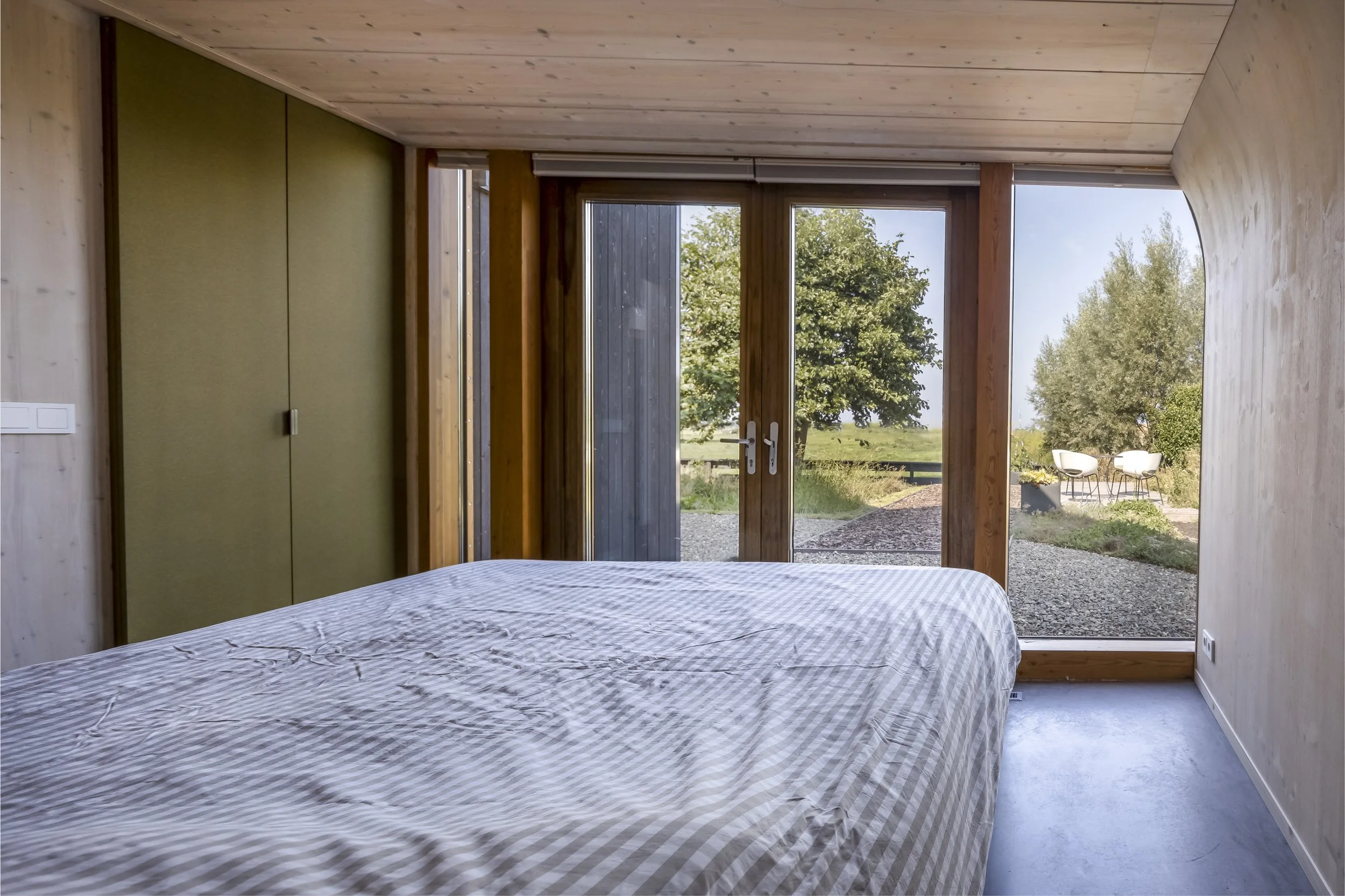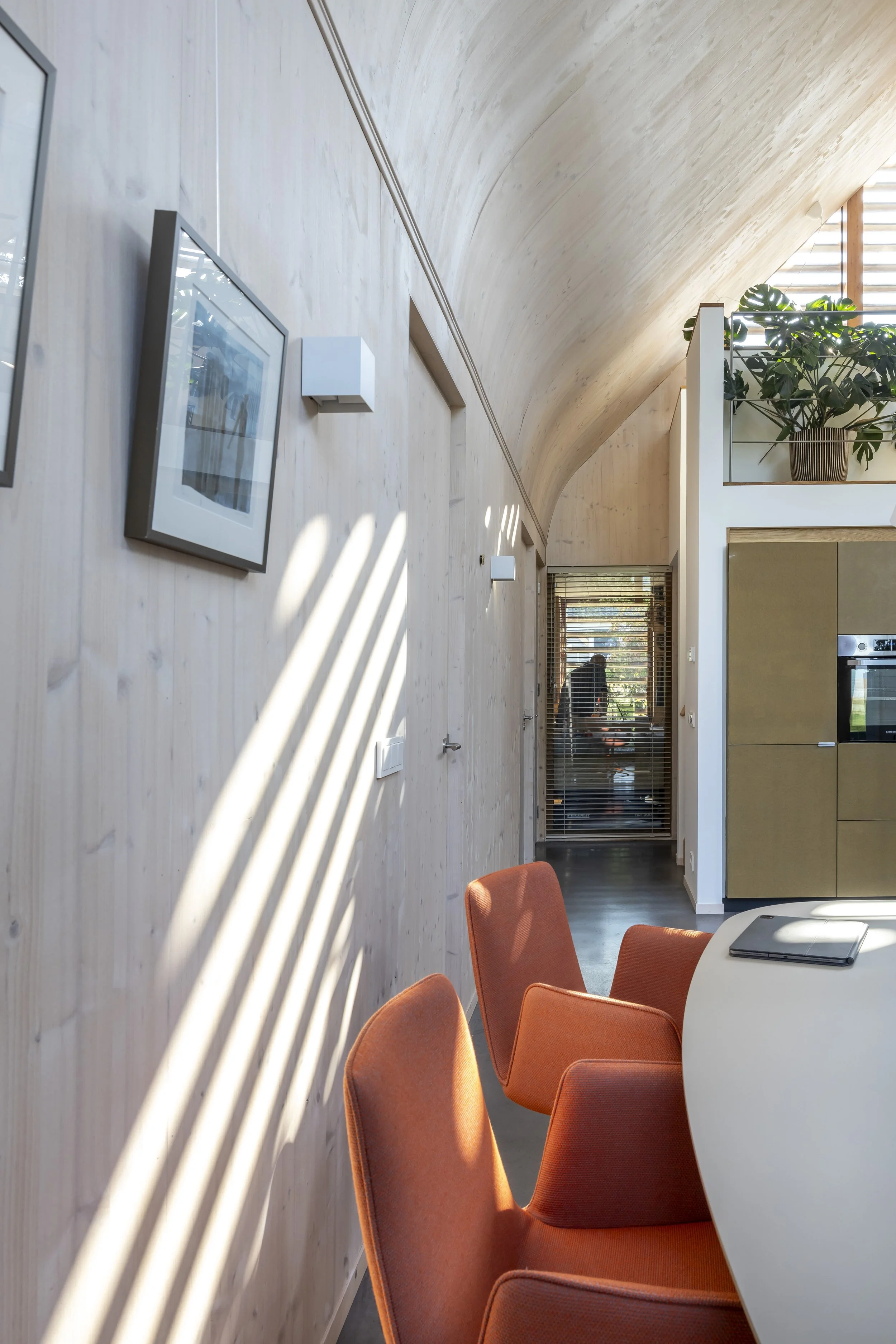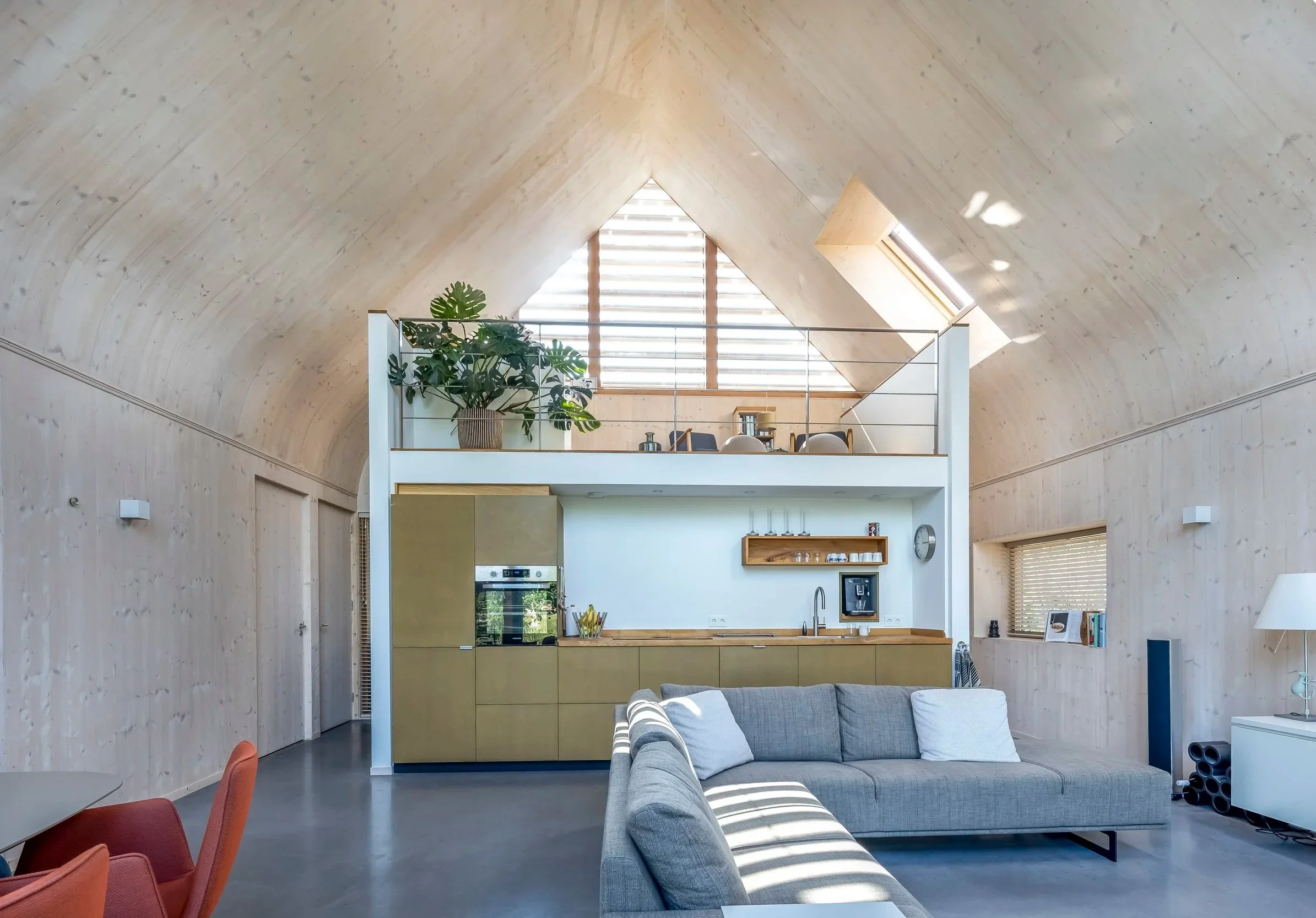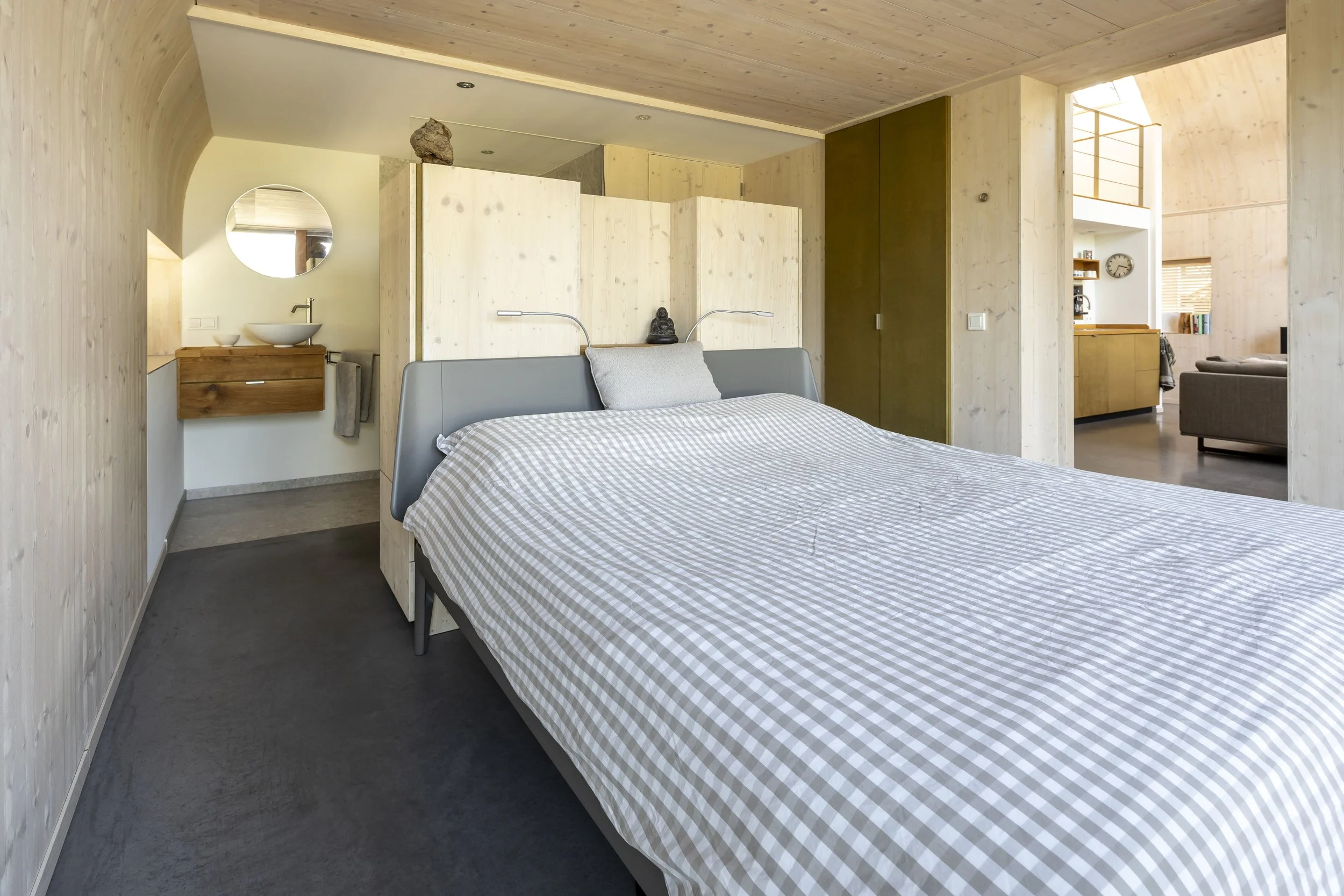 Nadat je door de voordeur binnenstapt kom je in een andere wereld: open, licht, met natuurlijke materialen. Wat versterkt wordt door de grote glazen pui aan de achterzijde die uitkijkt over de weilanden. Rondom de keuken komen de gebogen wanden die de Indigo van Woonpioniers kenmerken extra goed tot hun recht. Aan de achterzijde van dit keukenblok is de garderobe en een trap die naar een knus zithoekje op de verdieping leidt. De slaapkamer en werkkamer grenzen aan de grote leefruimte, in het kleinere volume. Met op de verdieping ruimte voor logees. Dit maakt de woning grotendeels rolstoelvriendelijk en dus levensloopbestendig.