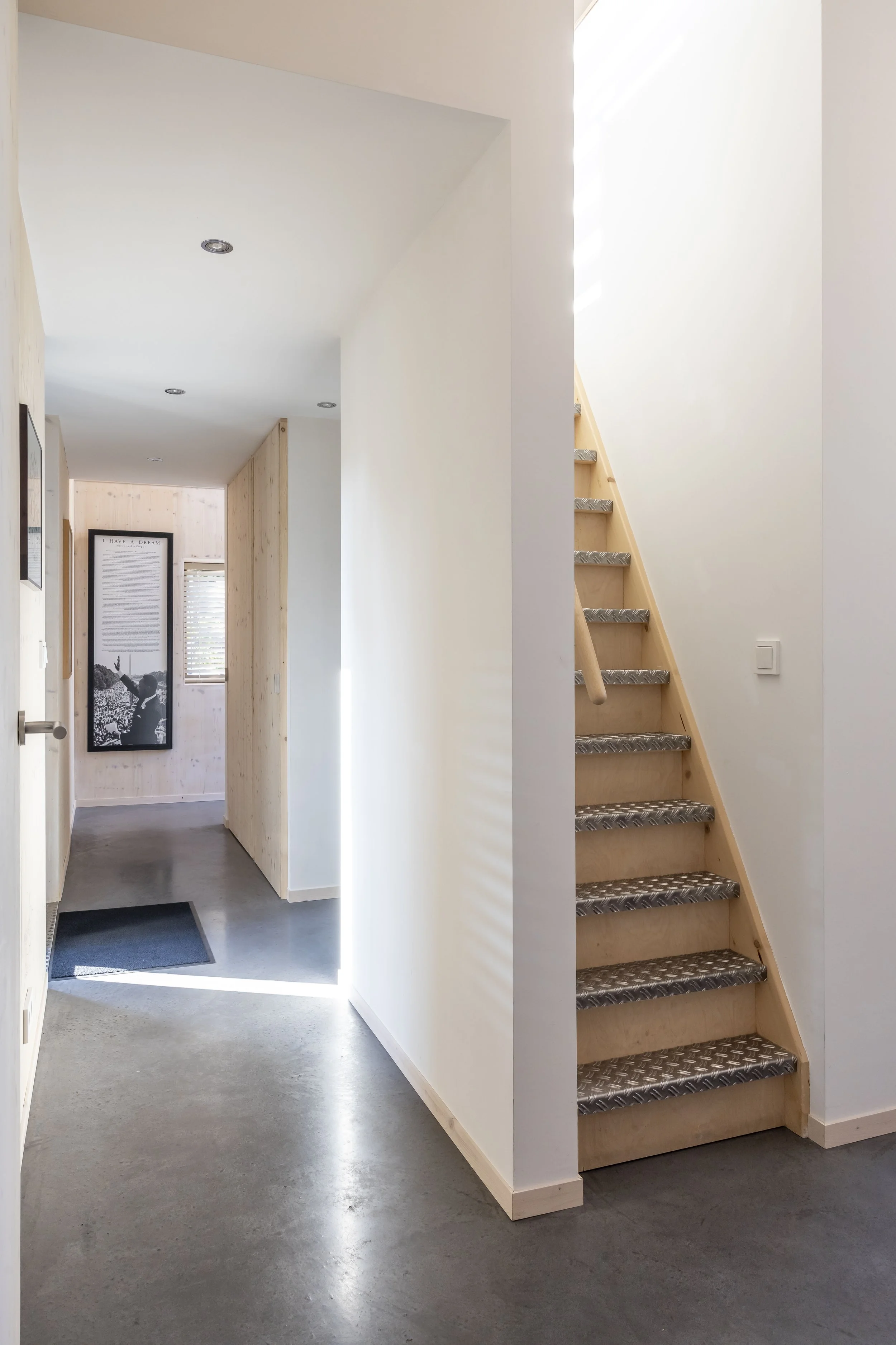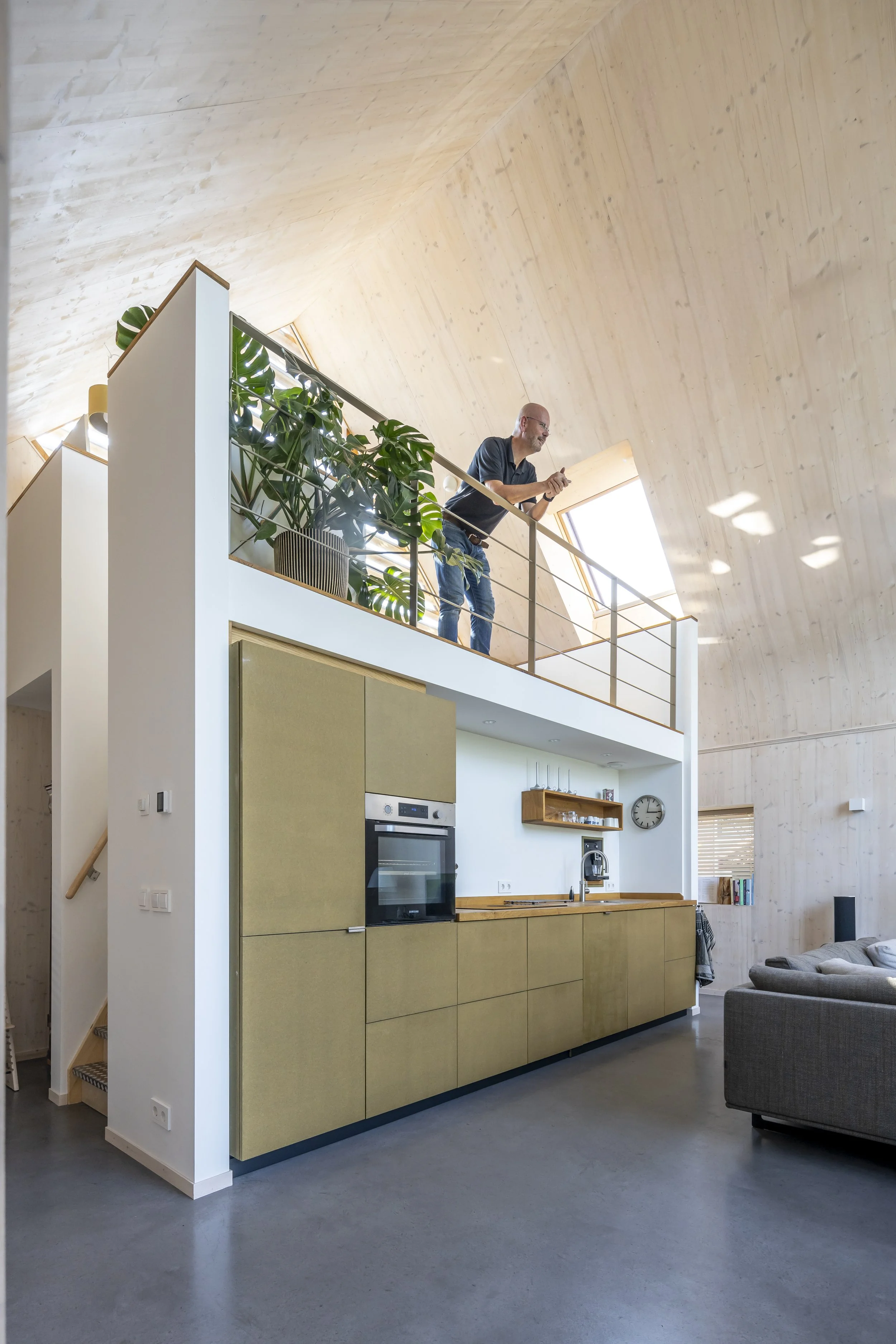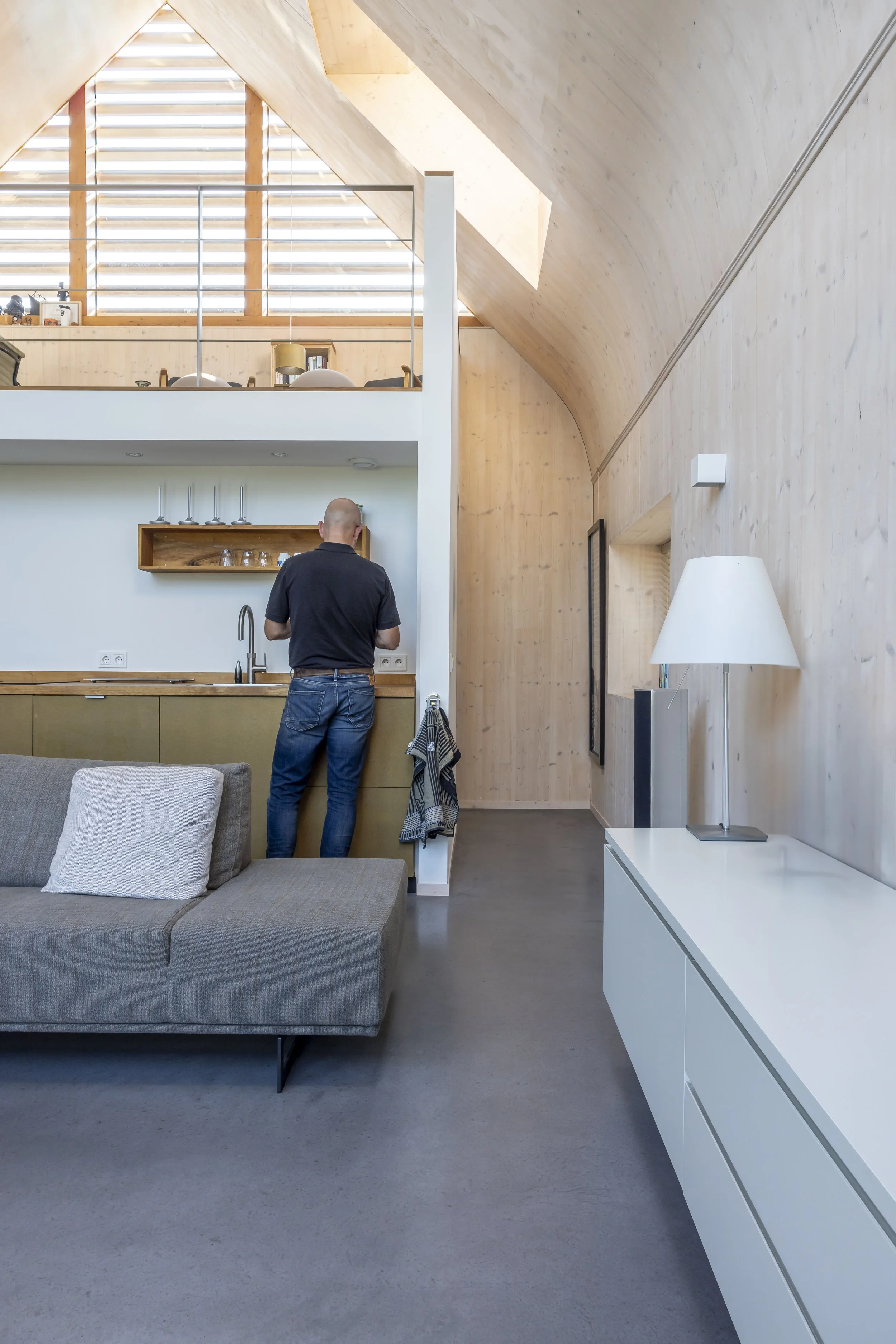 Nadat je door de voordeur binnenstapt kom je in een andere wereld: open, licht, met natuurlijke materialen. Wat versterkt wordt door de grote glazen pui aan de achterzijde die uitkijkt over de weilanden. Rondom de keuken komen de gebogen wanden die de Indigo van Woonpioniers kenmerken extra goed tot hun recht. Aan de achterzijde van dit keukenblok is de garderobe en een trap die naar een knus zithoekje op de verdieping leidt. De slaapkamer en werkkamer grenzen aan de grote leefruimte, in het kleinere volume. Met op de verdieping ruimte voor logees. Dit maakt de woning grotendeels rolstoelvriendelijk en dus levensloopbestendig.