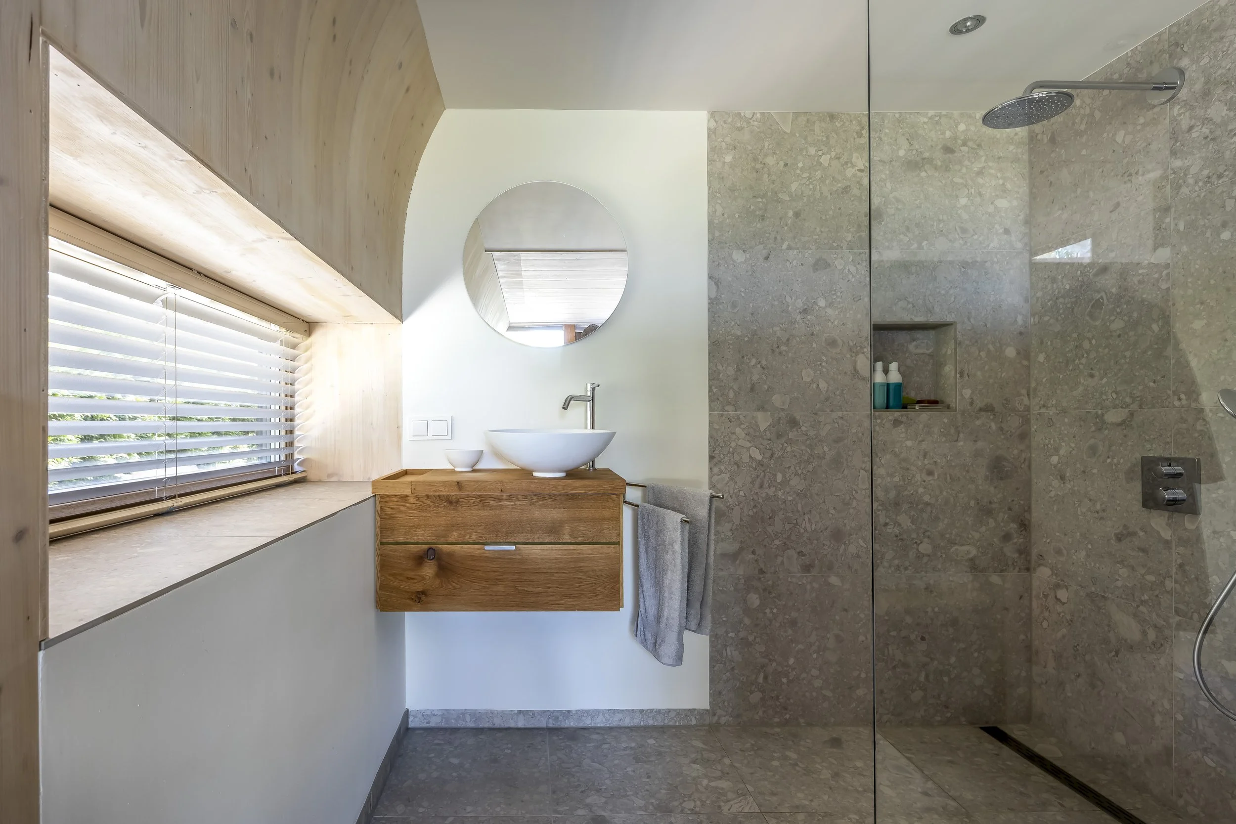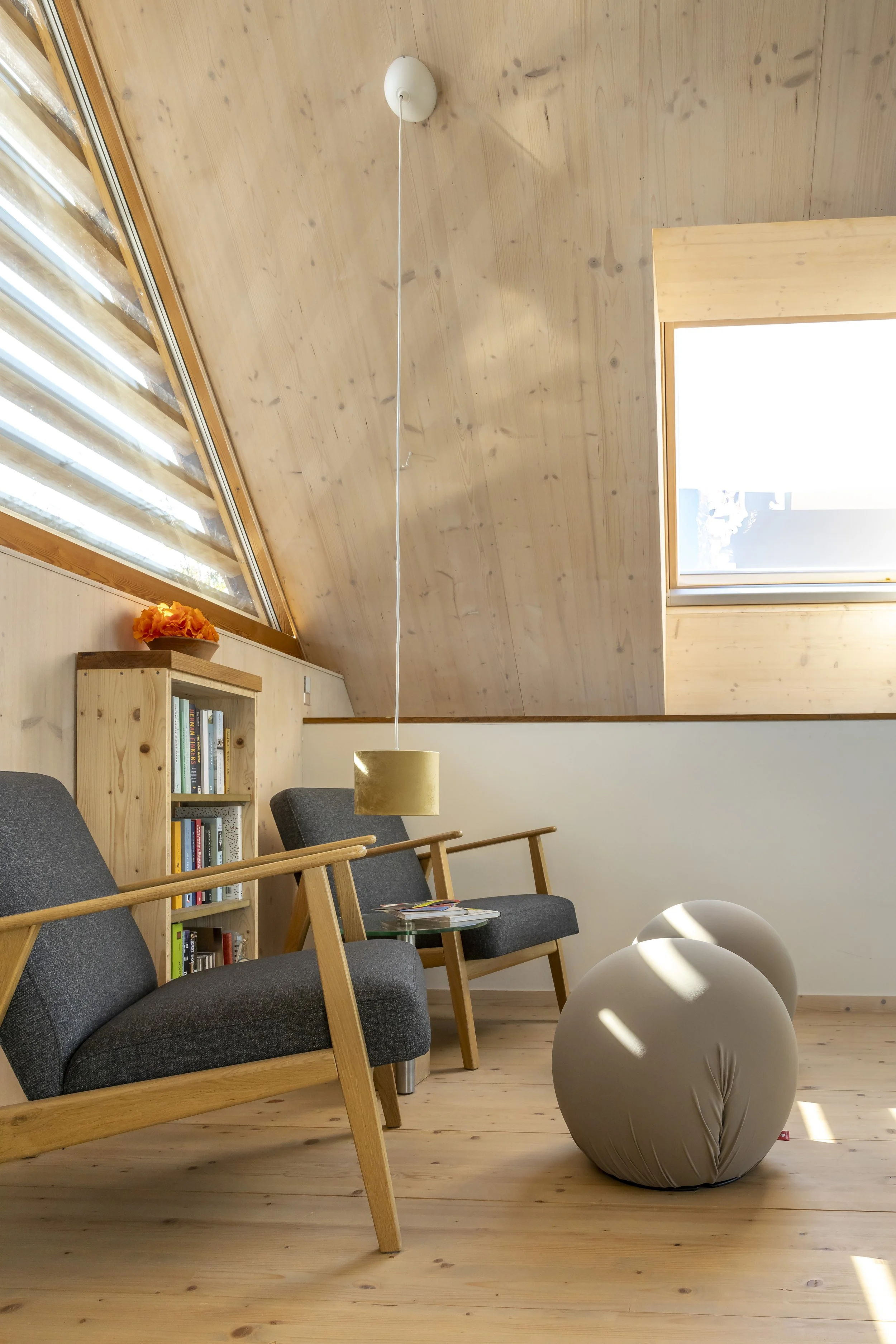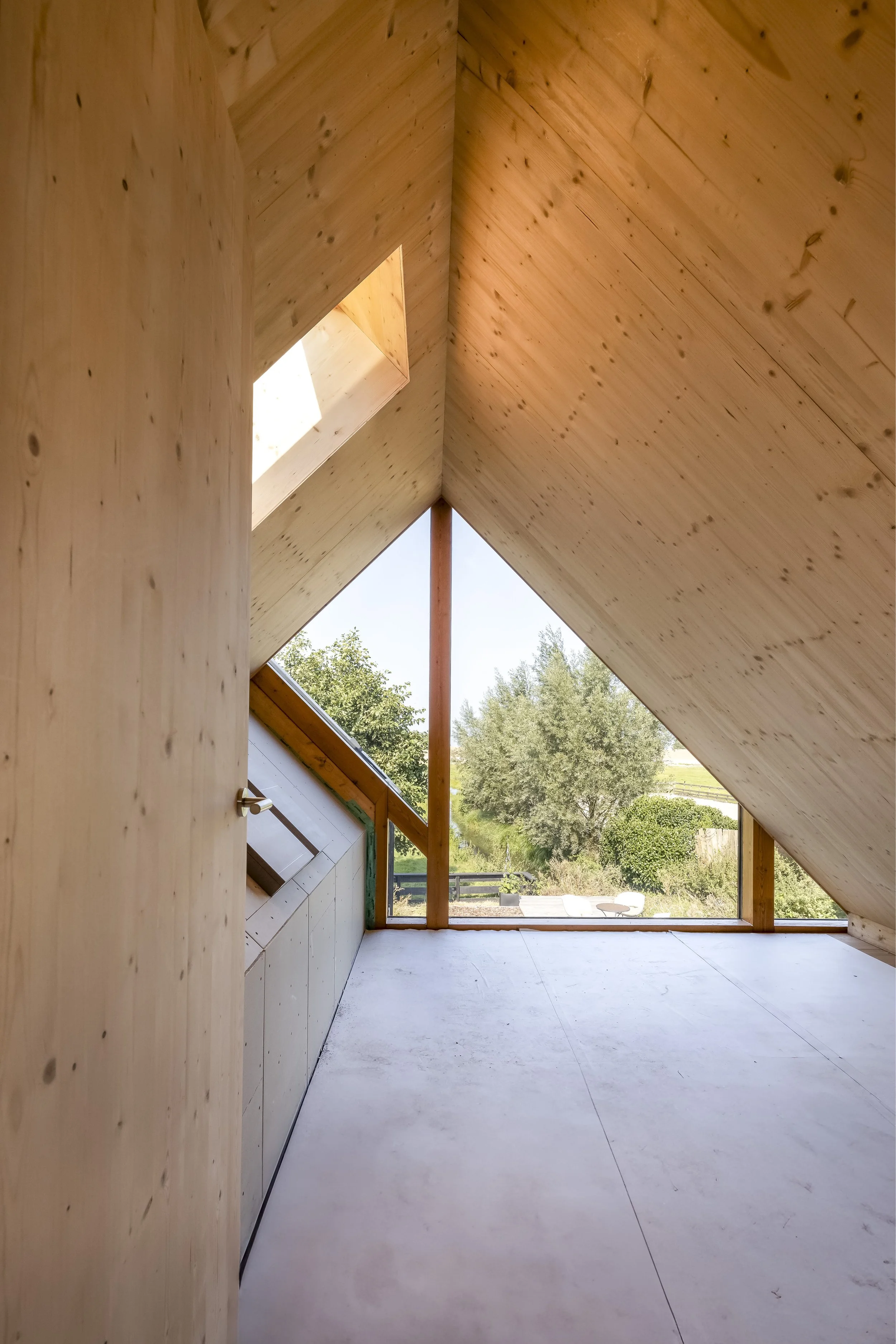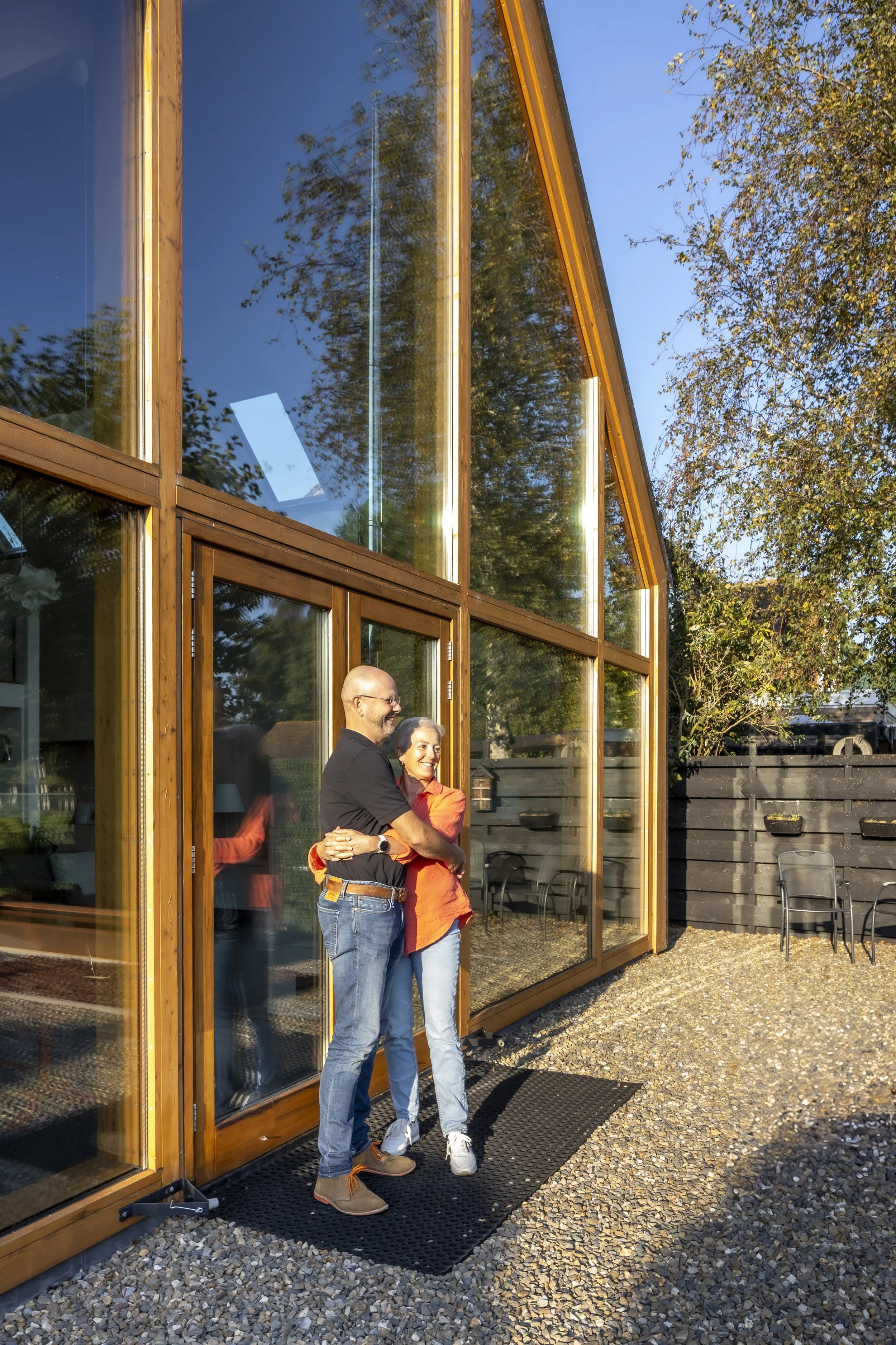 Nadat je door de voordeur binnenstapt kom je in een andere wereld: open, licht, met natuurlijke materialen. Wat versterkt wordt door de grote glazen pui aan de achterzijde die uitkijkt over de weilanden. Rondom de keuken komen de gebogen wanden die de Indigo van Woonpioniers kenmerken extra goed tot hun recht. Aan de achterzijde van dit keukenblok is de garderobe en een trap die naar een knus zithoekje op de verdieping leidt. De slaapkamer en werkkamer grenzen aan de grote leefruimte, in het kleinere volume. Met op de verdieping ruimte voor logees. Dit maakt de woning grotendeels rolstoelvriendelijk en dus levensloopbestendig.