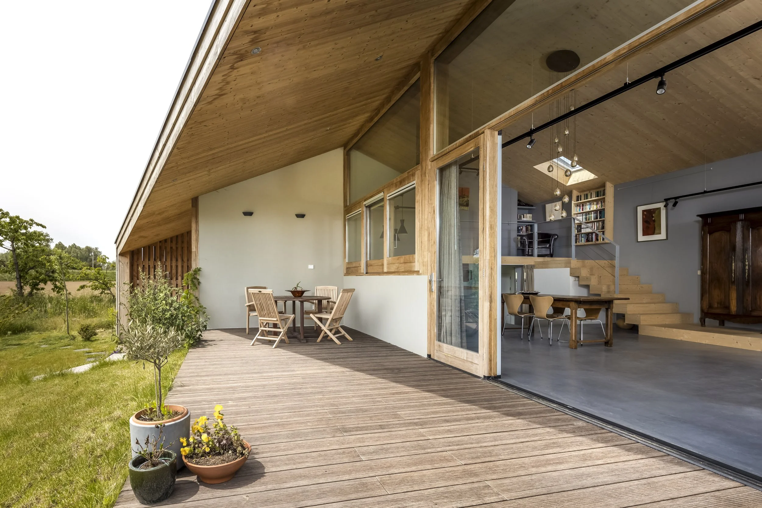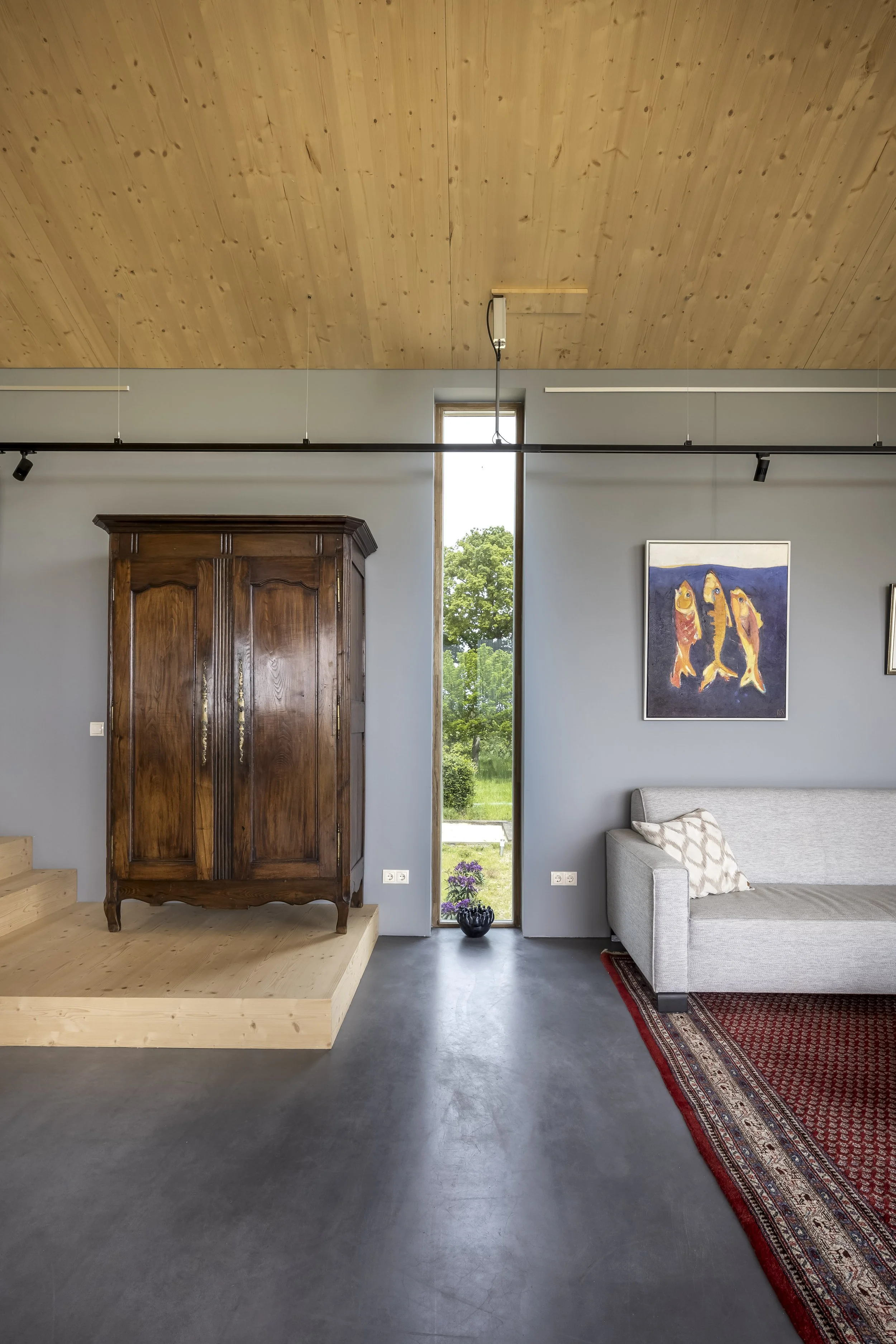 Bij deze houtskeletbouw woning draait alles om de muziek en ecologisch bouwen: een ruimtelijke woonkamer waar vooral de hoogte letterlijk lucht geeft. Met de grote glazen pui op het oosten en zuiden komt veel licht binnen. Het terras op het zuiden zorgt bij het open zetten van de pui dat de woonkamer anderhalf keer zo groot wordt. Het Franse plattelandsleven waait je bijna tegemoet, en dat vlakbij Nijmegen.