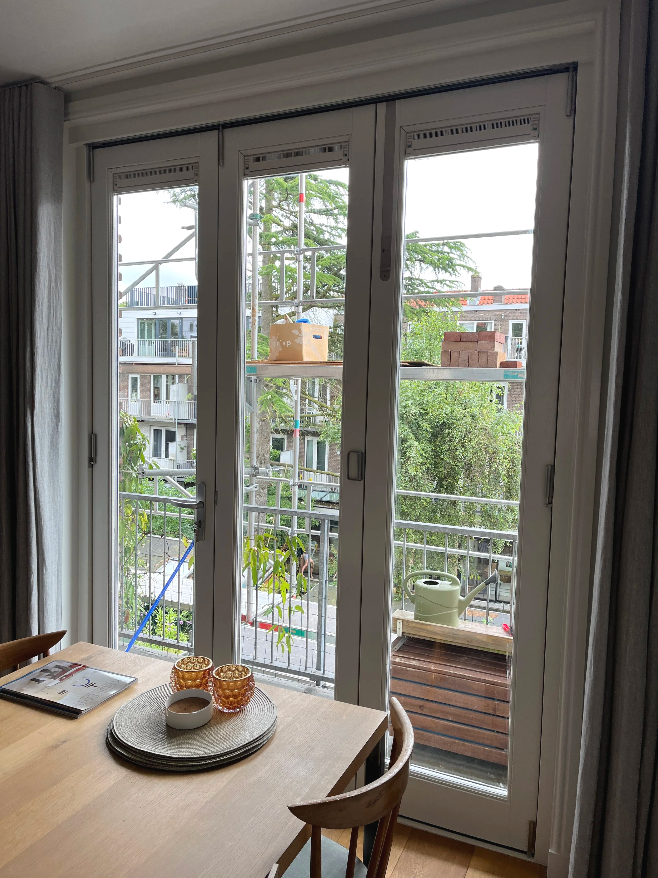 In de achtergevel kun je, wanneer de kozijnen vervangen worden, meteen kiezen of je hetzelfde kozijn terug laat plaatsen of iets anders wilt. In plaats van een dubbele deur is door sommige appartementen gekozen voor een grote vouwpui. Daardoor kan de achtergevel voor een groot deel open worden gezet. Een heerlijk zomers gevoel!