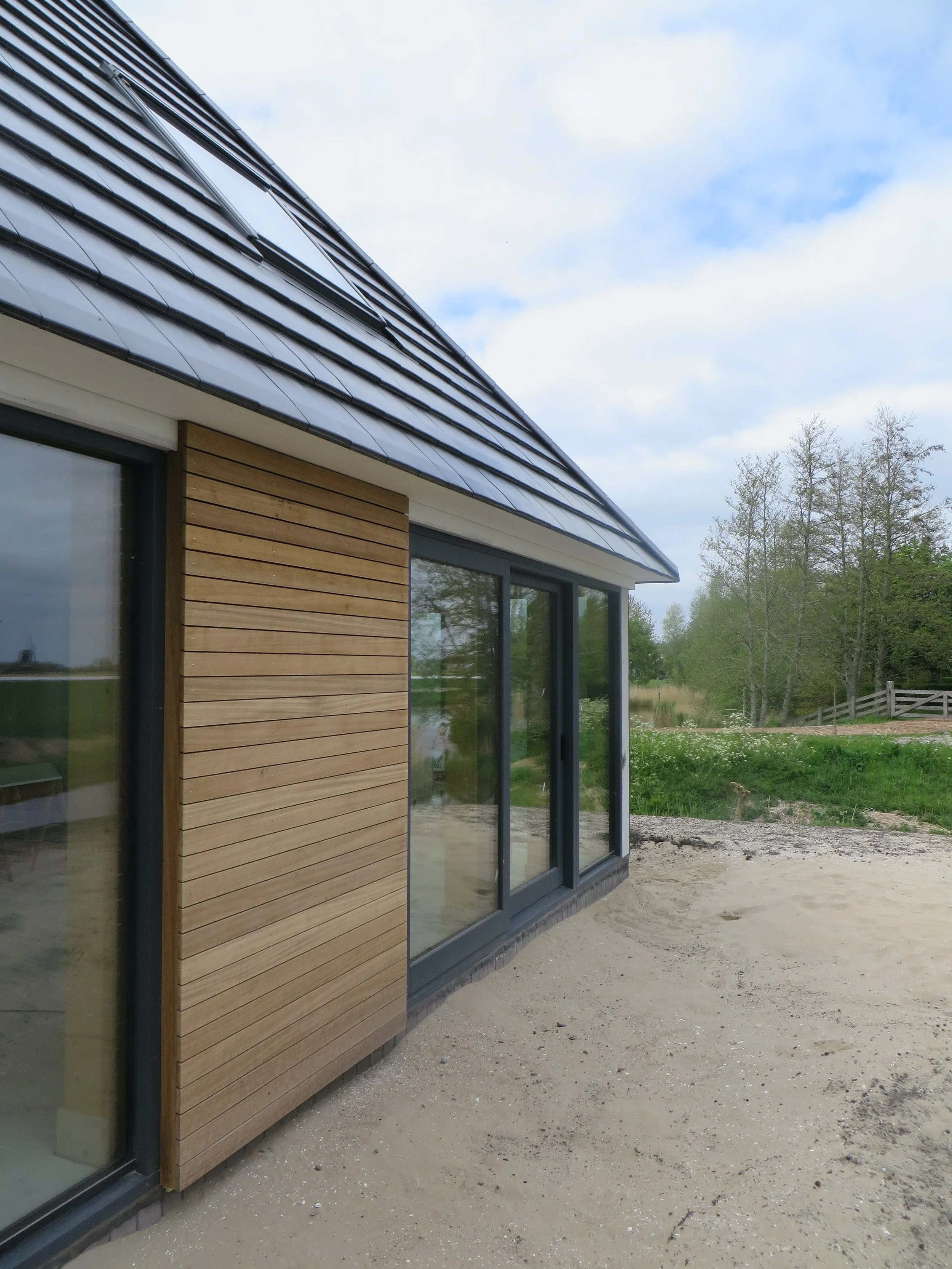 Compacte ecologische architectuur, passend in de omgeving en met een ingetogen vormgeving en materialisering.