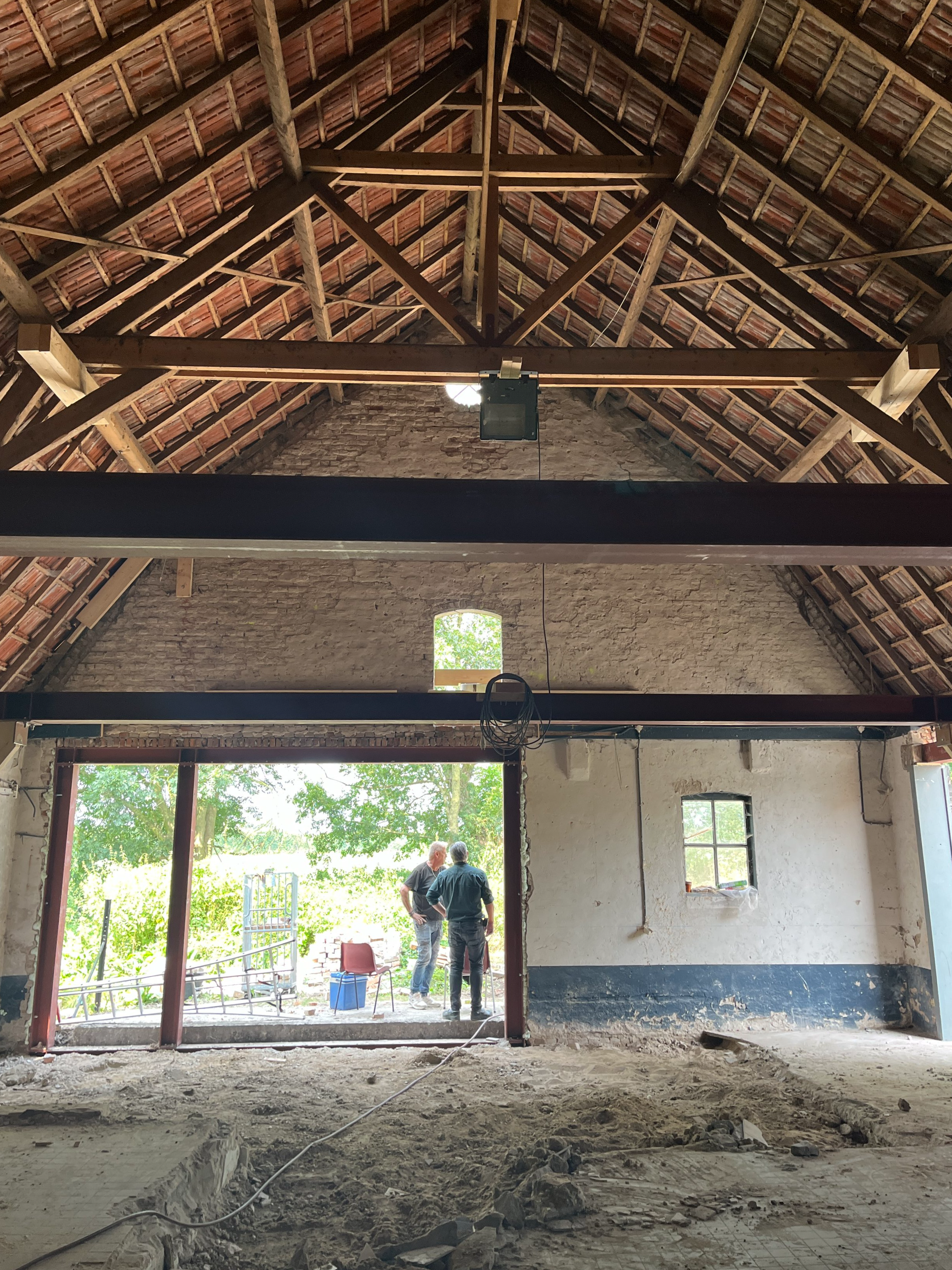 Bestaande situatie T-boerderij met links het voorhuis, en daarachter de schuur. Op de middelste afbeelding de oorspronkelijke kopgevel. Op de rechter afbeelding de schuur van binnen op het moment dat alle binnenwanden en vloeren gesloopt zijn. En in de kopgevel al een grote opening is gemaakt voor de toekomstige glaspui.