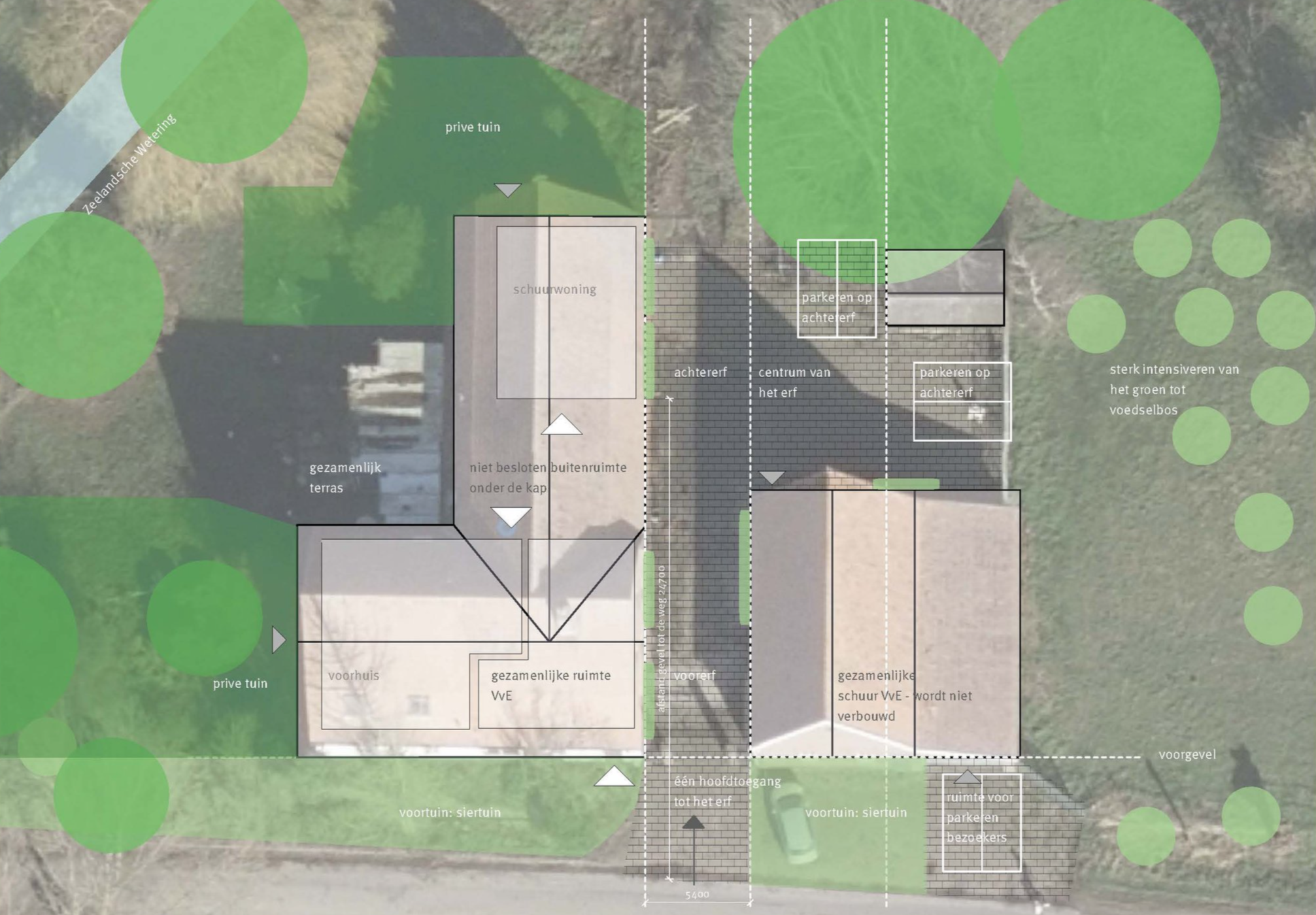 Als je het erf opkomt, zul je straks aan de linker kant een grote opening gaan zien die zicht biedt op de tuin aan de westzijde. Deze onderdoorgang onder de kap biedt toegang tot de woningen. Maar ook ruimte om samen te komen, aan een grote eettafel droog te zitten met beide gezinnen terwijl een zomerse regenbui overtrekt.