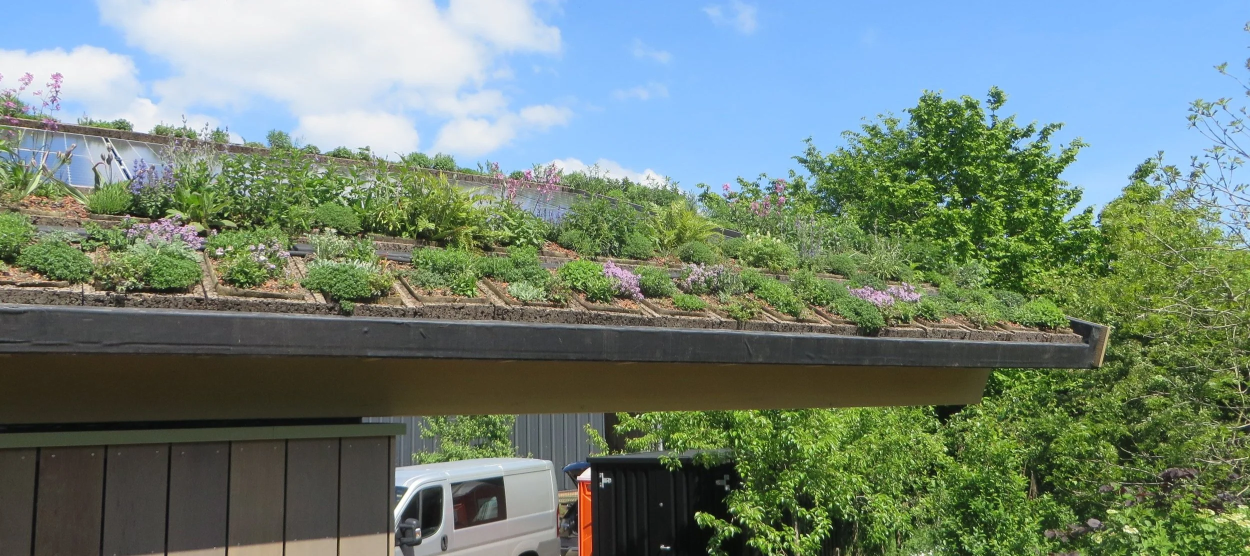 Ook het dak van Earthkweek met alle bloeiende en geurende tijm wordt fantastisch, de ingezaaide kurkbakken beginnen groen te kleuren en er groeit zelfs een kleine tulpensoort op het dak.